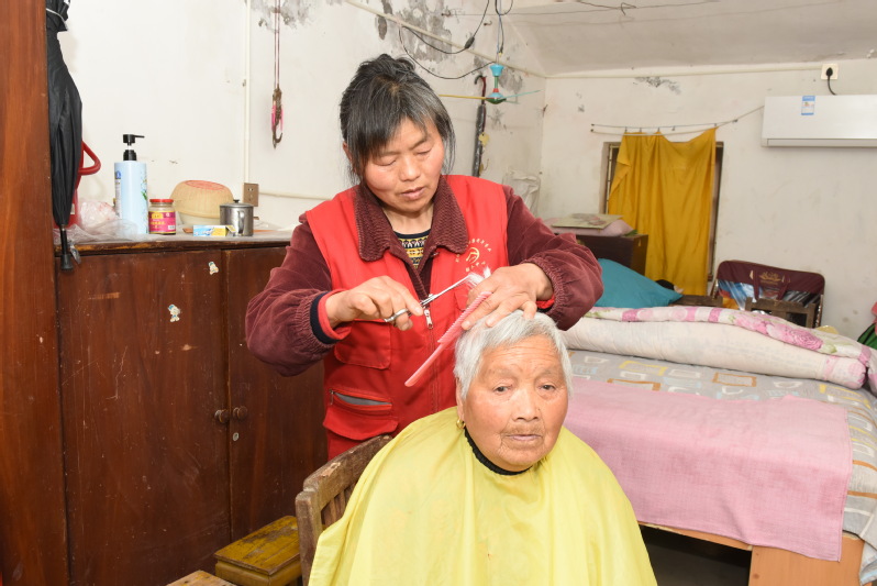 4月29日下午3时许,家住淮海农场振兴小区82岁的居民施维琴老人感觉十分清爽,因为淮海农场居家养老志愿服务人员张荣芳,对她的头发好好地修剪了一番。