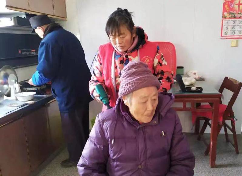我们在金奶奶家看到,身着志愿服装的沈善兵、张荣芳两人,他们在麻利地为老人进行健康体检、理疗等服务,同时为老人家整理床铺、打扫厨房、刷洗积尘等卫生服务工作,让金奶奶老两口开心不已之时,又感叹着两位志愿者的倾情服务,让他们有了儿女在家的感觉。