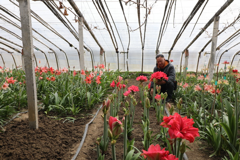 在种植培育朱顶红种苗基础上,销售也是关键一步。目前,种球售价都在40-50元/粒,主要利用电商平台线上、线下销售,产品远销北京、上海、内蒙、四川、河南、河北、辽宁、山东等全国三十多个省市,鲜切花也打开了市场,5元/枝销往苏州、南京、上海等地,供不应求,做到不出门就接单、方便快捷。特别是近年疫情常态化的态势下,电商平台尽显优势。