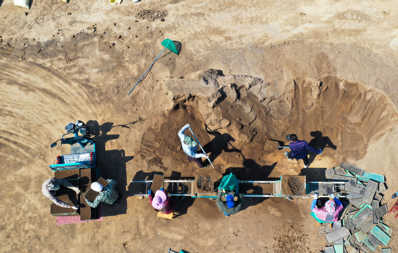 5月1日,宝应湖农场三分场场头一派忙碌,摆盘、铲土、倒稻种,7、8名工人分工合作,有序进行着落谷育秧。