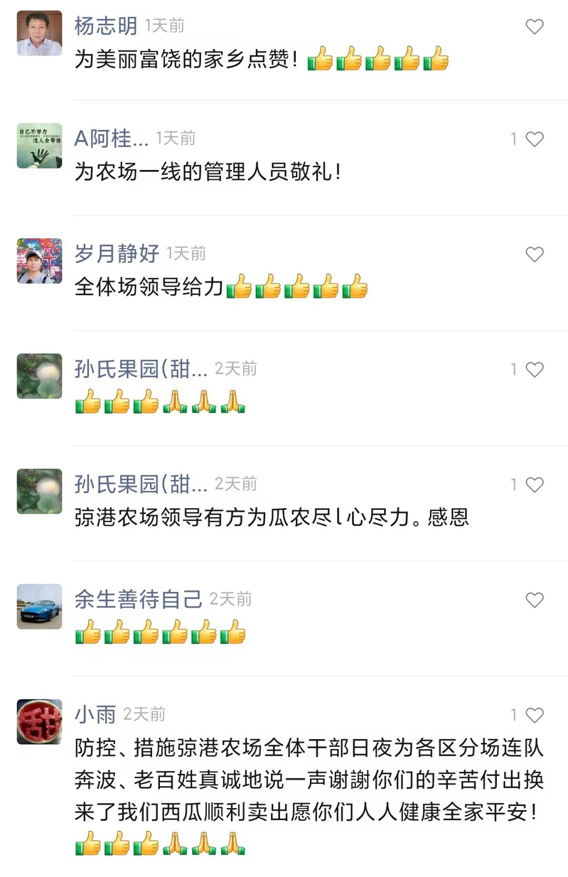 西瓜场来临正值疫情防控形势最严峻的时候,按照上级疫情防控要求,弶港农场党委制定出防控西瓜运销车辆闭环管理工作方案,成立西瓜运销“疫”线指挥部,设立八个工作专班,近百人的西瓜闭环运销队伍,日夜奋战,全程严密管控西瓜运销货车闭环管理,确保全国各地货车开得进来,农场职工西瓜卖得出去。在这场战役中,全场广大党员干部在抗“疫”一线“佩党徽、亮身份、做表率”,以“一名党员一面旗帜”的良好形象,全力以赴,吃苦在前、冲在一线,弶港农场2万多吨“弶农”牌西瓜顺利销售。“美丽弶农”视频号上反映西瓜运销工作的小视频,7千多次浏览量,几百人点赞转发,闭环运销工作得到广大职工群众的一致称赞,公司党委书记胡广斌在工作群中感叹道“得到群众的好评不容易”。