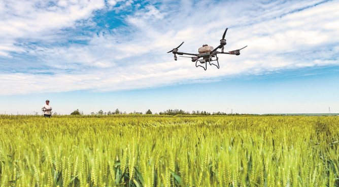 在射阳县江苏农垦新洋农场,无人机飞手进行“一喷三防”作业。张伟生