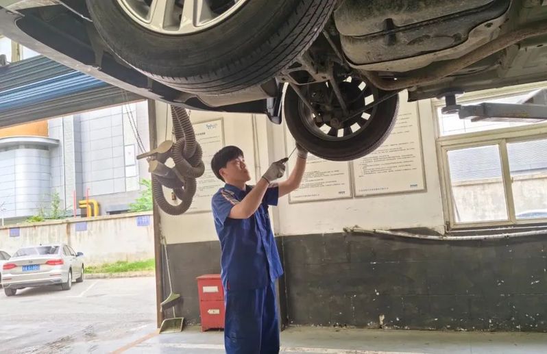 苏舜汽车公司(上汽大众4S店)机电技师周亚威正在为保养车进行全车检查,他认真清理着轮胎上的石子,为客户消除车辆行驶中打滑、漏气、爆胎等隐患,保障车辆行驶安全。