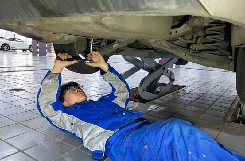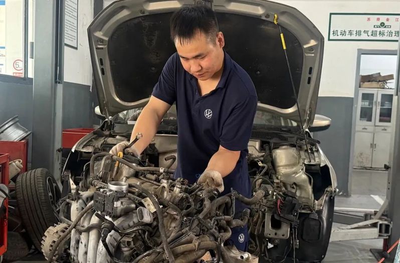 苏舜金江公司(上汽大众4S店)机电技师钱平岗正拆解一辆帕萨特车的发动机,他说:“客户着急用车,这个假期就不休息了,要尽快把车修好。”