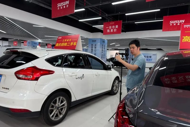 苏舜省交公司(高端二手车销售)主播解跃文正在通过镜头向客户全方位展示各款车型,详细介绍车辆的外观、内饰、参数、配置等信息,让客户切实感受到“云”购车的贴心、诚心和安心。