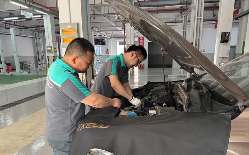 苏舜舜江公司(上汽荣威、奇瑞星途4S店)技术经理潘学银正在指导机电技师黄楠正在维修一辆因发动机故障导致无法正常行驶的车辆,黄楠说:“修车真的是一项需要经验和技术的工作,每一次操作都是一次挑战。”