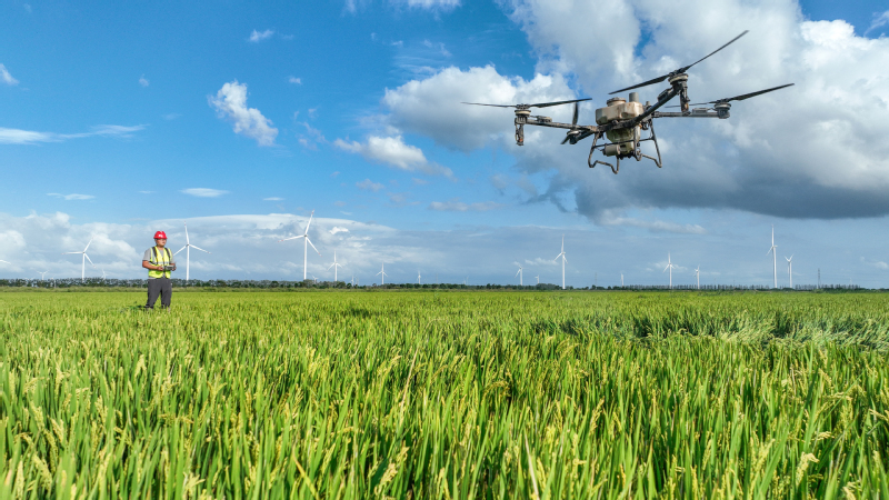 9月22日,苏垦农发新洋分公司使用搭载北斗导航系统的植保无人机,对处于灌浆期的水稻进行秋季田管作业。