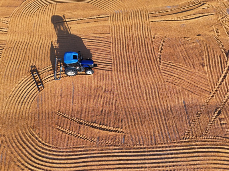 2025年10月9日,江苏农垦岗埠农场,职工驾驶粮食翻晒机,利用晴好天气抓紧翻晒刚刚收获的玉米,确保秋粮颗粒归仓。
