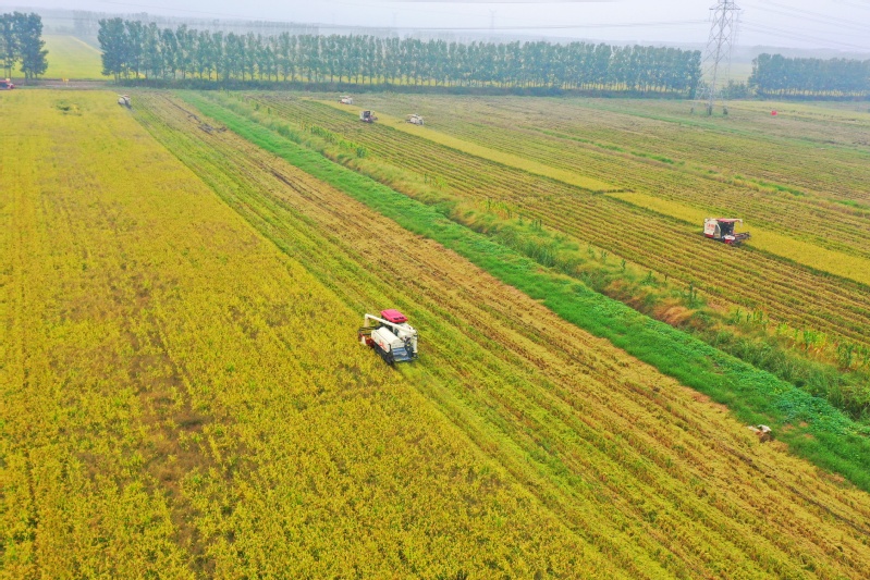 2025年10月10日,苏垦农发岗埠分公司正在抢收水稻。秋收时节,天气复杂多变,给秋收工作带来一定困难,岗埠分公司按照“成熟一块、收获一块”的原则,组织200多台收运机械,集中力量加紧进行机械抢收作业,确保成熟玉米、水稻等秋粮及时归仓。