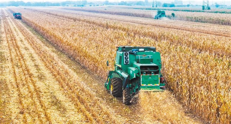 10月15日,农机手驾驶收割机在江苏省连云港市云台农场小汪生产区田间收割玉米。该市整合63个烘干中心,295台烘干机开足马力,日烘干能力可达1.02万吨,确保秋粮应收尽收。 王健民摄
