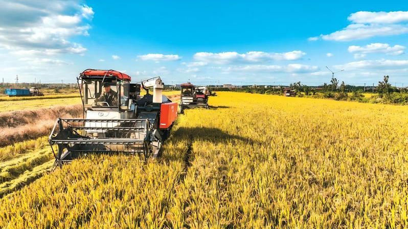 江苏省盐城市射阳县,江苏农垦新洋农场工作人员抢收水稻。张伟生摄 (人民图片)