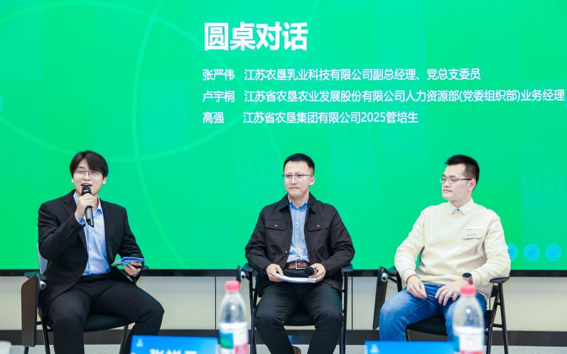 在“从校园人到农垦人”成长分享环节,南京农业大学校友代表苏垦乳业副总经理张严伟、苏垦农发人力资源部业务经理卢宇桐、集团公司2025届管培生高强分别讲述了他们在江苏农垦的职业轨迹与心路历程。张严伟更结合自己担任面试官的经验,向学弟学妹送出“自信、真诚、专业”六字面试秘籍,并鼓励大家坚守农业人的理想与初心。