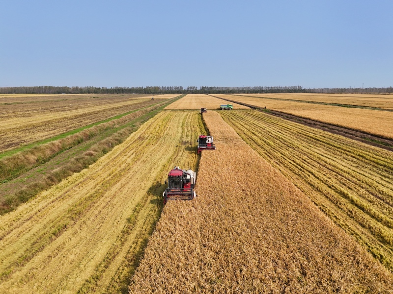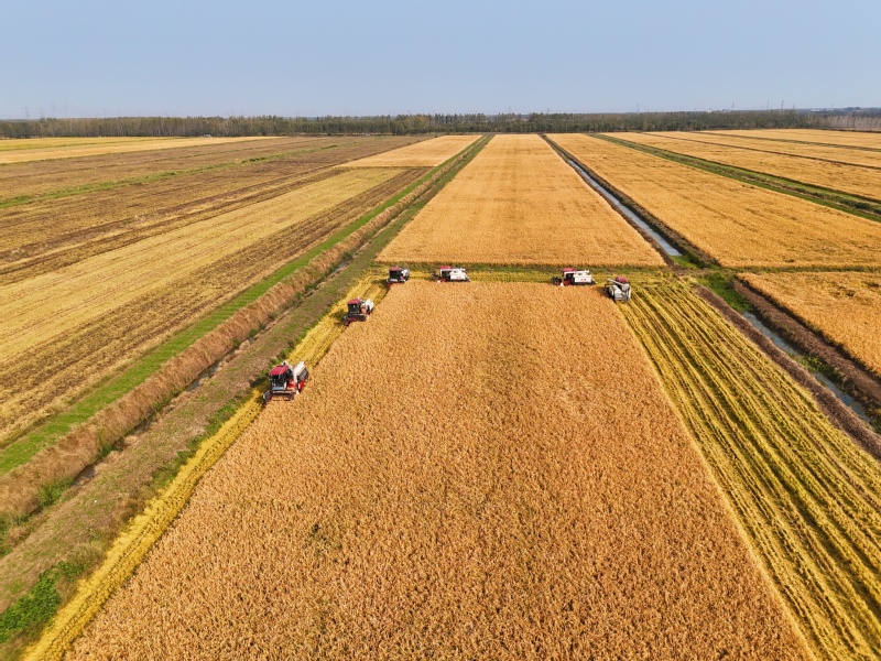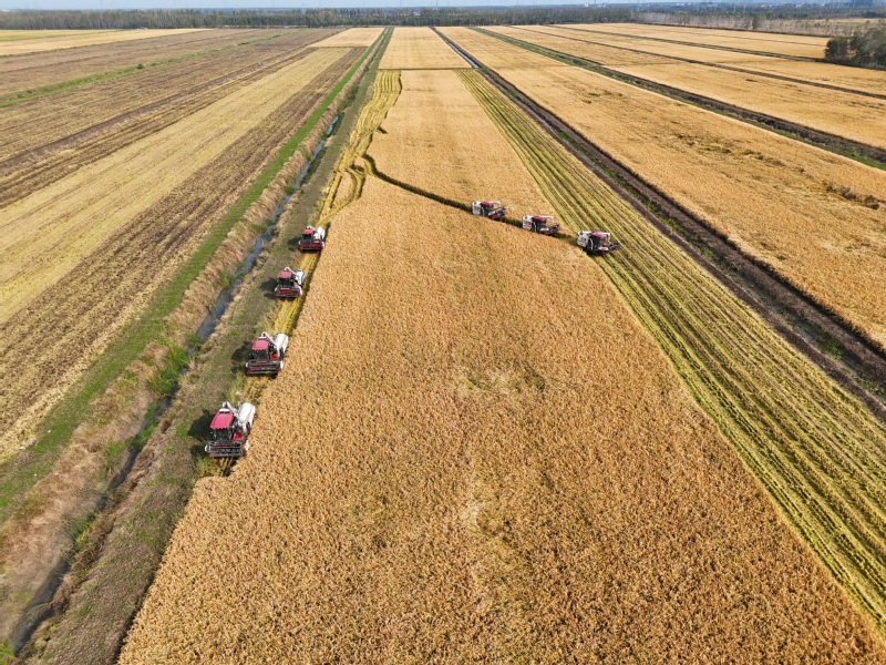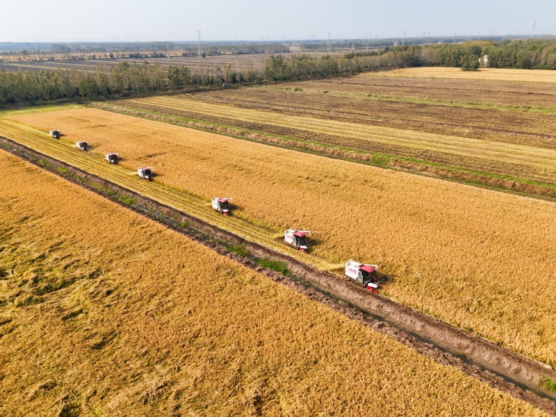 10月28日,江苏省连云港市海州区的江苏农垦岗埠农场,7台收割机在农田里进行杂交水稻收割作业。连日来,岗埠农场5万亩优质水稻陆续进入成熟收获期,当地抢抓晴好有利天气,积极组织农机、人员进行水稻收获、晾晒及烘干工作,确保优质水稻颗粒归仓。