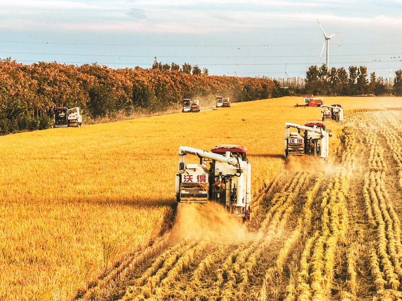 11月3日,江苏省盐城市射阳县新洋农场组织收割机械抢收水稻。张伟生摄(人民视觉)
