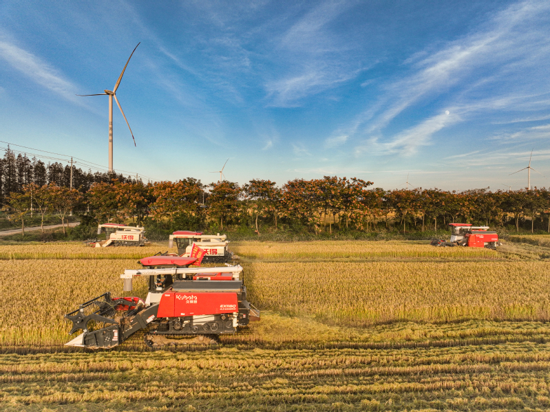 11月3日,江苏省盐城市射阳县新洋农场组织收割机械,对高标准农田中的优质水稻进行抢收作业,确保秋粮颗粒归仓,不误农时。 作者:张伟生