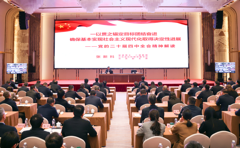 报告会上,张新科围绕学习贯彻习近平总书记在党的二十届四中全会上的重要讲话精神和全会《建议》,从深刻认识党的二十届四中全会的重大意义,准确把握“十五五”时期在基本实现社会主义现代化进程中的重要地位,全面理解“十五五”时期经济社会发展的战略任务和重大举措等方面,结合我国经济社会发展实际情况,运用生动案例和翔实数据,进行了系统阐释和全面解读。他指出,全会取得的重大成果、作出的重大部署,充分体现了以习近平同志为核心的党中央团结带领全党全国各族人民续写经济快速发展和社会长期稳定两大奇迹新篇章、奋力开创中国式现代化建设新局面的历史主动,必将对党和国家事业发展产生重大而深远的影响。要把学习贯彻全会精神同学习领会习近平新时代中国特色社会主义思想贯通起来,结合习近平总书记对江苏工作重要讲话精神,做到学深悟透、狠抓落实,奋力谱写“强富美高”新江苏现代化建设新篇章。