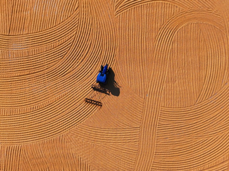 随着天气转好,岗埠农场加紧推进秋粮收获、晾晒等工作。图为10月22日,岗埠农场职工驾驶翻粮机械,利用晴好天气晾晒玉米。在蓝天白云的映照下,翻粮机在金色的玉米上划出一道道优美的弧线,刻画出秋日的美好“丰”景。