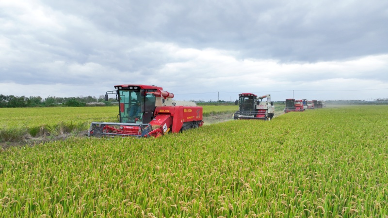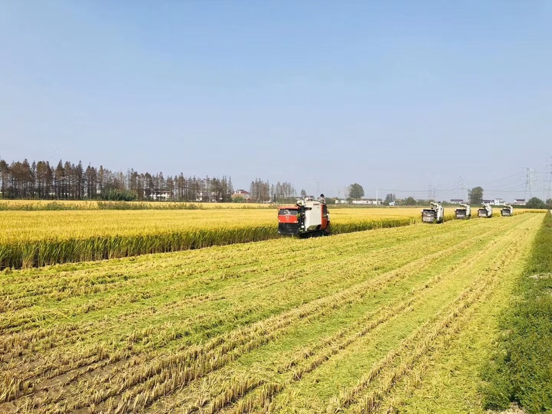 11月3日,苏垦农发新洋分公司组织收割机械抢收优质水稻,确保秋粮颗粒归仓。